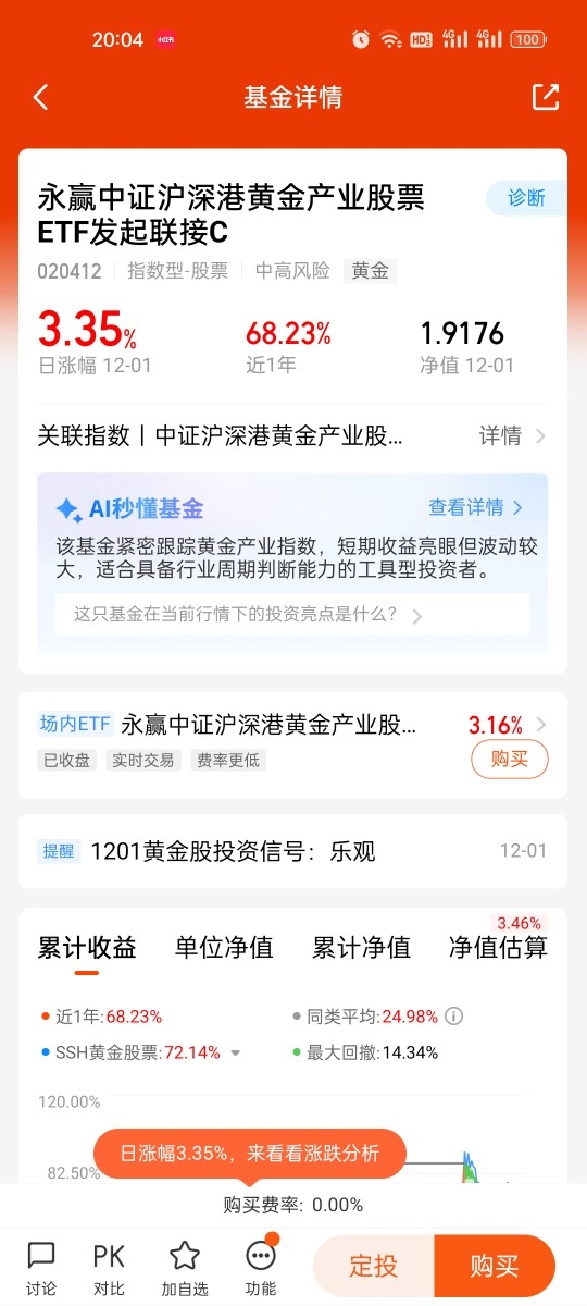 永赢黄金股ETF020412今天净值继续大涨,今天涨幅3.35%,还好之前一直拿