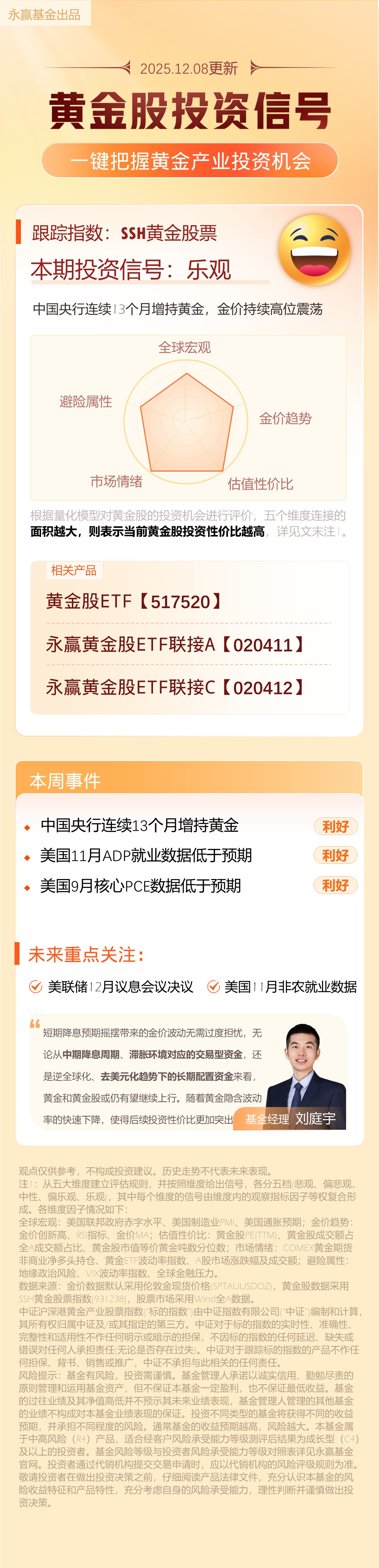 1208黄金股投资信号:乐观。中国央行连续13个月增持黄金,金价持续高位震荡。