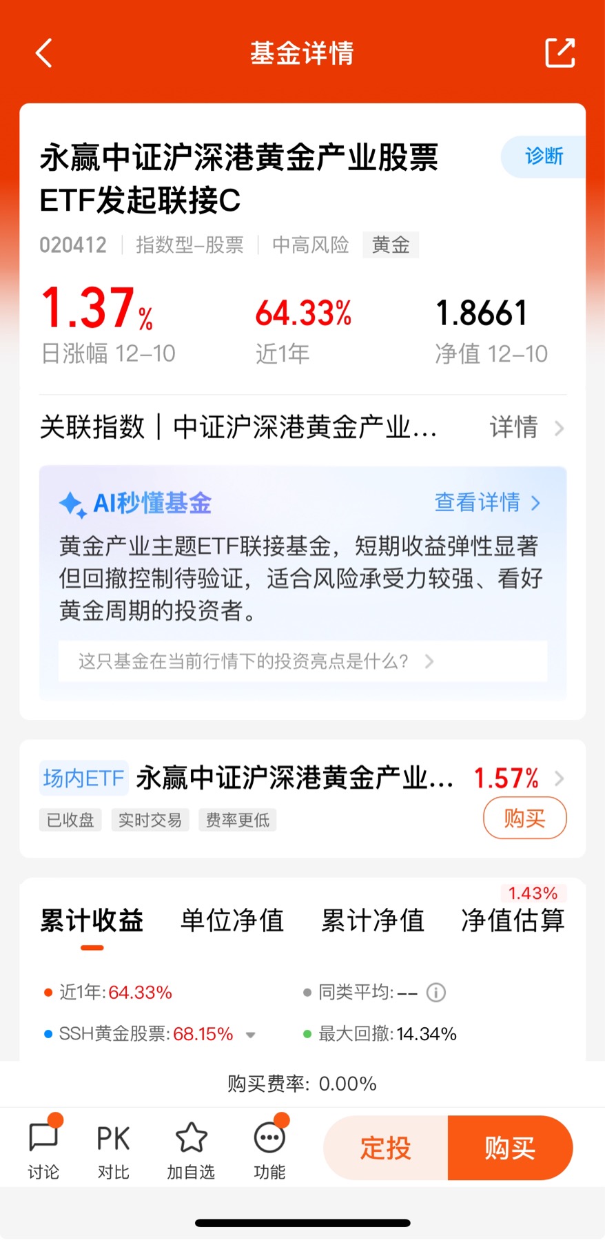 $永赢中证沪深港黄金产业股票ETF发起联接C$今天不错收1.37%,近6个月收2