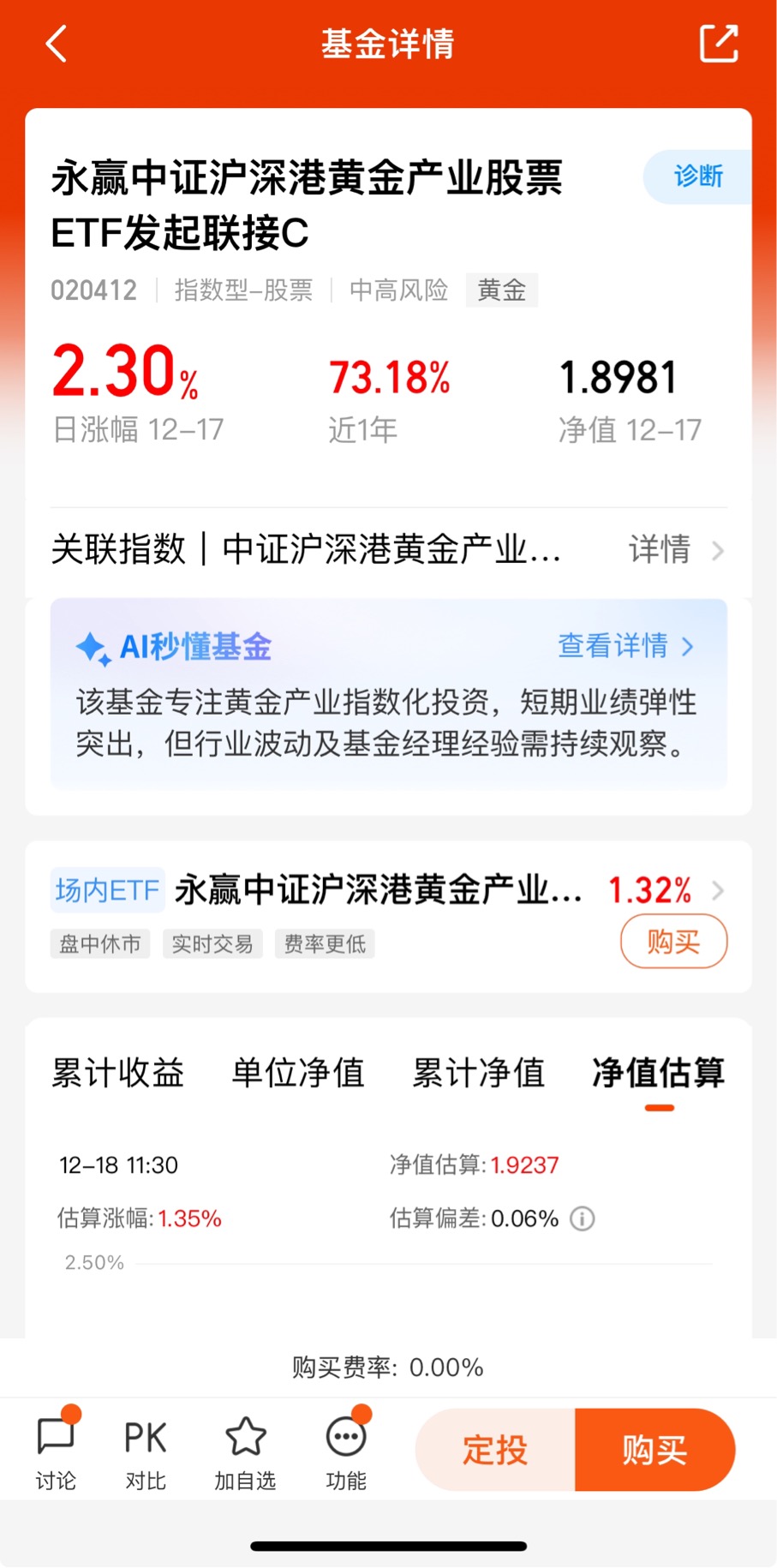 $永赢中证沪深港黄金产业股票ETF发起联接C$ 昨天收2.30%,近3个月收7.35%,近6个月收29.19%,近一年收73.18%表现优秀!凭借着对金价放大器的深度聚焦,严格跟踪中证沪港深黄金产业股票指数,把投资范围精准锁定在金矿开采、冶炼及黄金零售领域的龙头企业。不同于直接投资实物黄金或普通黄金ETF,它通过布局黄金产业链上的优质标的,能借助金价放大器效应,让投资者在金价上涨周期中获得更丰厚的收益。#【跨年坦白局】提问金梓才、陈果#