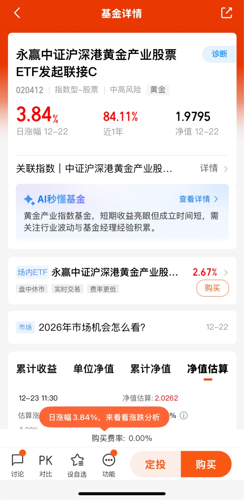 #现货黄金创历史新高!你上车了吗?# 黄金板块近期表现强劲,12月23日纽约现货黄金触及4481.4美元/盎司的历史新高,年内涨幅近70%。$永赢中证沪深港黄金产业股票ETF发起联接C$ 昨天大涨3.84%,近一个月收益10.41%,近六个月收益38.03%,近一年收益84.11%,长期业绩优秀;全球央行近年来加速增持黄金,用于优化外汇储备结构,为黄金需求提供了长期稳定支撑。黄金进入新一轮上涨空间,投资选弹性更大的永赢黄金股联接C就很不错。
