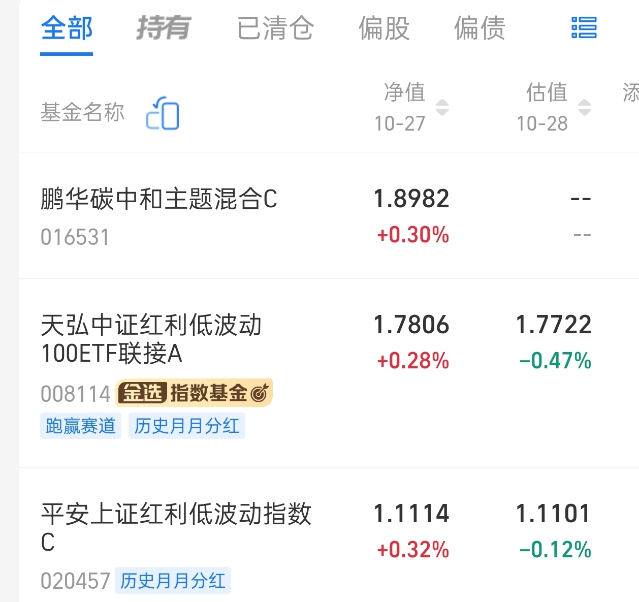 $天弘中证红利低波动100ETF联接A$ 昨晚涨了0.28%,还是可以的,继续加油