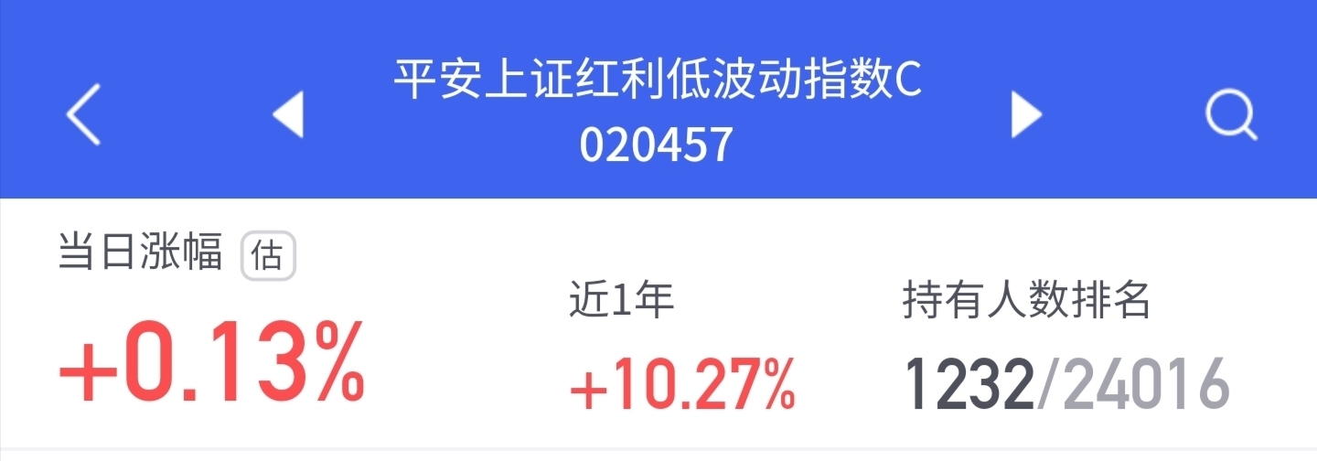 大盘今天跳水跳得有点多,还好红利扛大旗,$平安上证红利低波动指数C$ 目前估值涨0.13%,近一年涨10.27%,跑赢银行和纯债基妥妥的,今天继续冲~