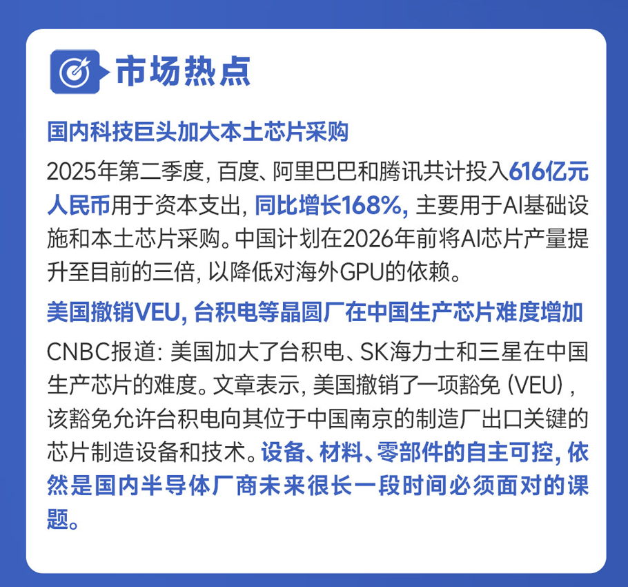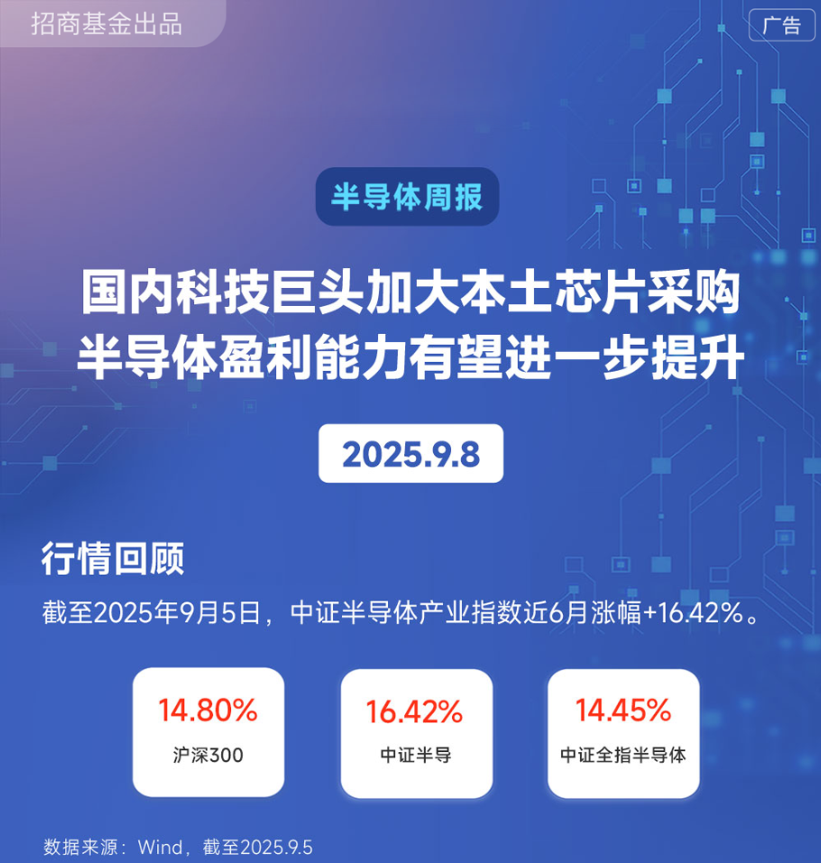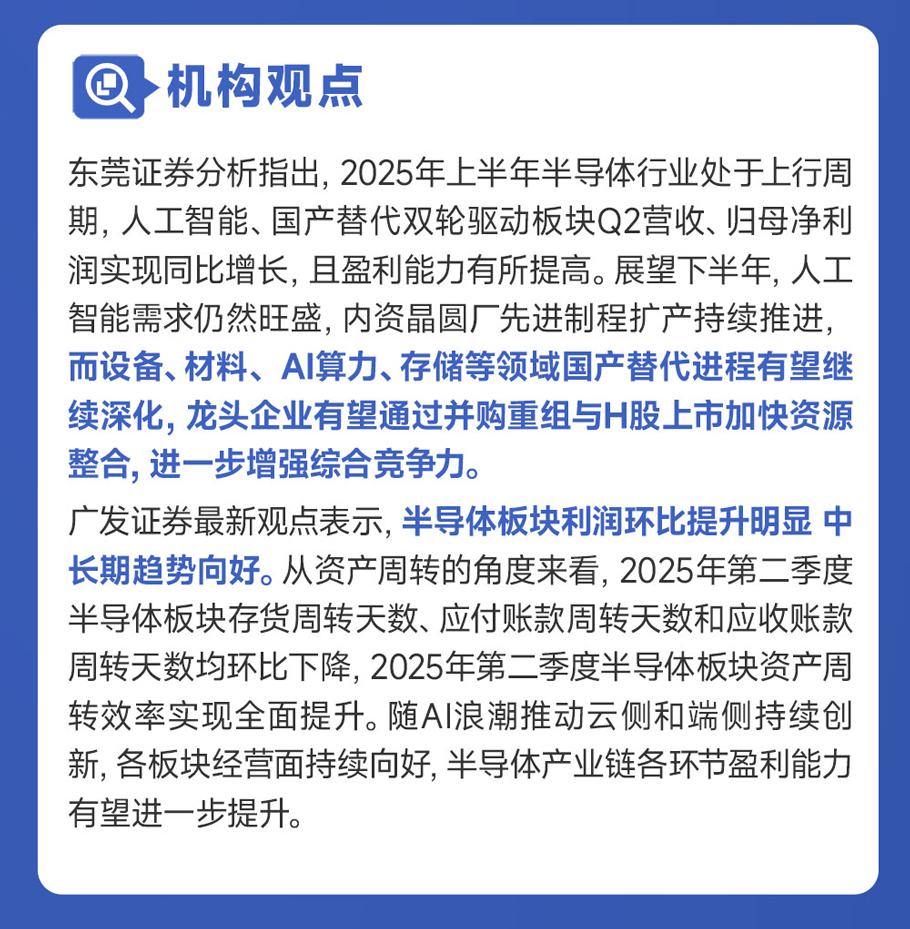 东莞证券分析指出,2025年上半年半导体行业处于上行周期,人工智能、国产替代双轮驱动板块Q2营收、归母净利润实现同比增长,且盈利能力有所提高。展望下半年,人工智能需求仍然旺盛,内资晶圆厂先进制程扩产持续推进,而设备、材料、AI算力、存储等领域国产替代进程有望继续深化,龙头企业有望通过并购重组与H股上市加快资源整合,进一步增强综合竞争力。