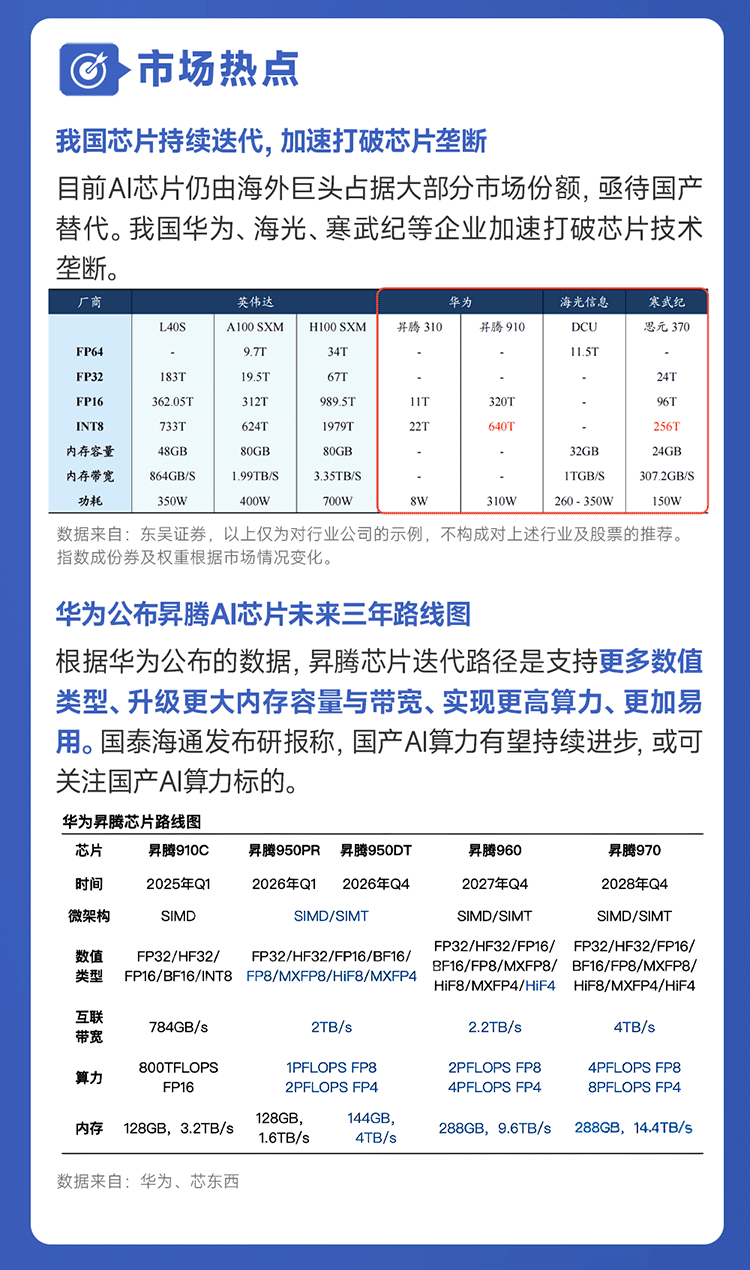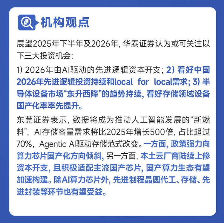 东莞证券表示,数据将成为推动人工智能发展的“新燃料”,AI存储容量需求将比2025年增长500倍,占比超过70%,Agentic AI驱动存储范式改变。一方面,政策强力向算力芯片国产化方向倾斜,另一方面,本土云厂商陆续上修资本开支,且积极适配主流国产芯片,国产算力生态有望加速构建。除AI算力芯片外,先进制程晶圆代工、存储、先进封装等环节也有望受益。