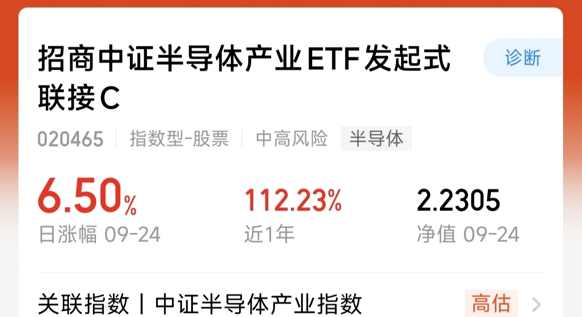 关注到$招商中证半导体产业ETF发起式联接C$ 。这只聚焦半导体的指数基金。精准跟踪中证半导体产业指数,持仓聚焦半导体产业,前十大重仓股包含北方华创、中微公司、海光信息等龙头企业。这些企业在技术研发、市场份额等方面具有优势,抗风险能力较强,长期趋势面良好!基金跟踪精准度高。昨天涨幅6.5%,同类涨幅第一,再次超出了指数的涨幅。近一年涨幅达到了112.23%。大幅稳定跑赢同类平均业绩。也是稳稳跑赢了指数的涨幅。长期稳定收益能力强!虽然下午来看,半导体板块有所冲高回落。但是目前表现的依然比较平稳。所以说对于半导体板块长期的表现,我还是有信心。我坚定看好基金在未来半导体板块行情中的成长表现。