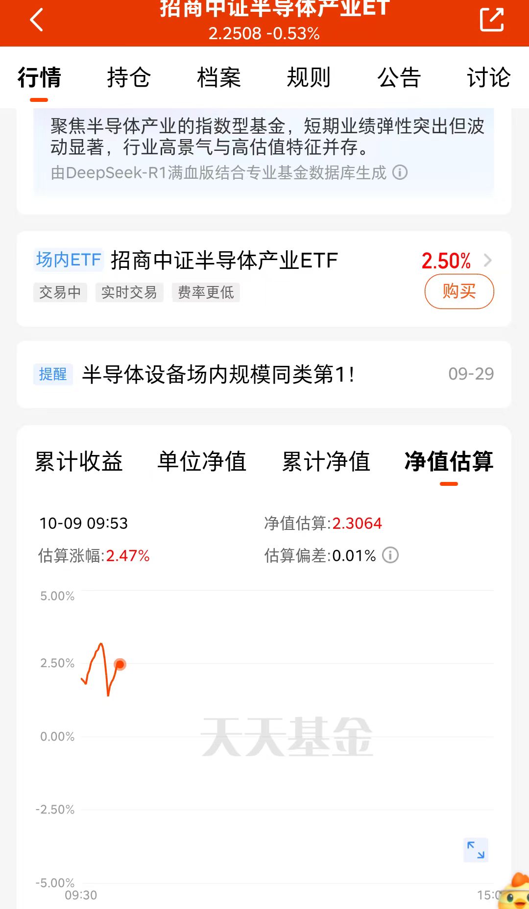 假期结束,开始搬砖。9月酝酿了那么久,今天大盘指数高开高走,我看有望冲破3900点,近期日韩股市政策红利延续,港股科技股带动A股半导体板块补涨,今天半导体板块继续上涨,$招商中证半导体产业ETF发起式联接C(OTCFUND|020465)$盘中估值上涨2.47%,涨幅还在不断拉升。近一年上涨72.49%,同类中第一呢,可以关注一下。
