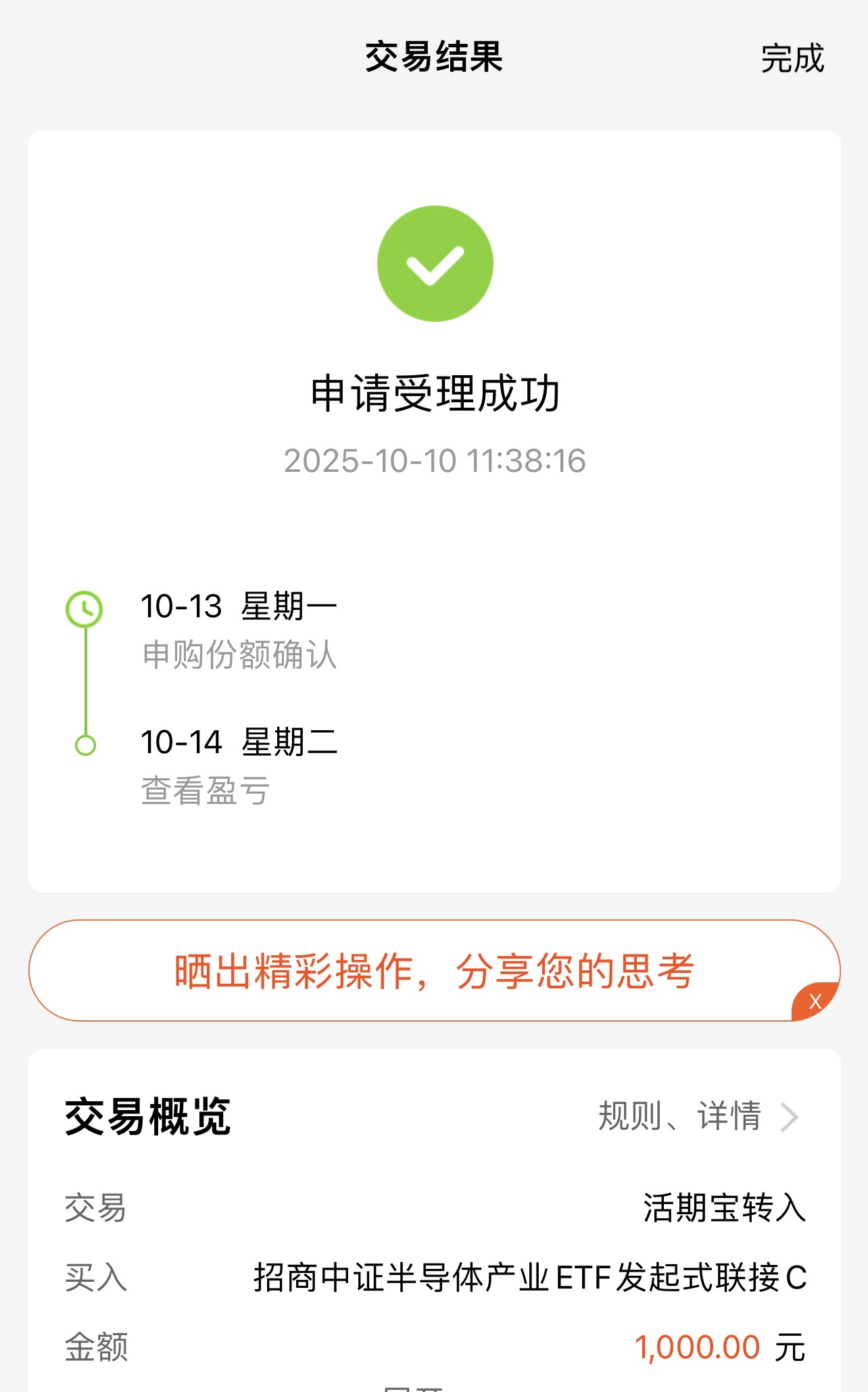 今天趁着小幅回调,逢跌加仓了1000元招商半导体C。四季度我依然坚定看好半导体板块,逻辑很清晰:日韩政策红利持续释放,港股科技股近期活跃,A股半导体有望迎来补涨行情。