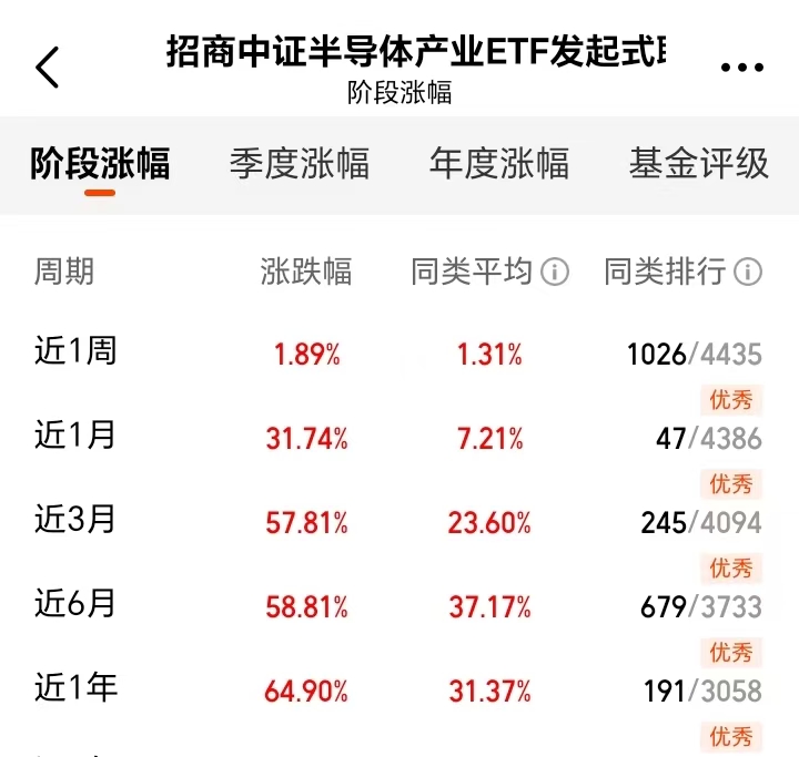 近期 A 股市场行情偶有波动,但整体延续向好态势,半导体产业最近表现亮眼,成为市场中的强势板块。高盛也上调中芯国际和华虹半导体的目标价格,且国产替代进程持续催化,日韩股市政策红利还在延续,港股科技股带动A股半导体板块补涨。$招商中证半导体产业ETF发起式联接C(OTCFUND|020465)$近一年大涨64.9%,长期业绩表现出色。我也准备逢低加仓起来,继续看好第四季度半导体板块的表现啦!
