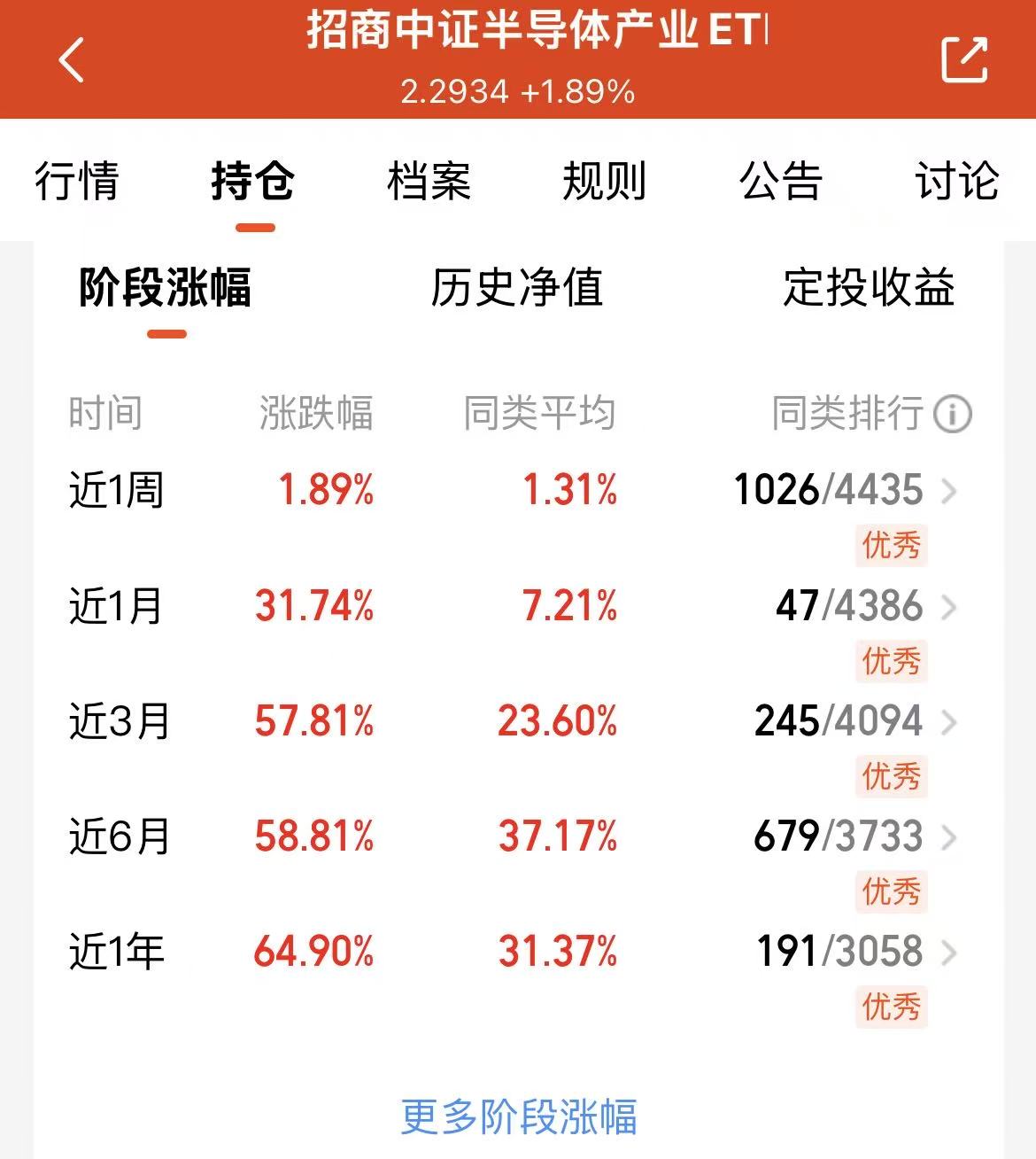 #国庆节后 A股市场如何看?#今天大A低开震荡调整,半导体也迎来回调,不过长期来看,行情趋势还是向上的,逢低布局也是不错的选择。$招商中证半导体产业ETF发起式联接C(OTCFUND|020465)$估值下跌4%,近一个月涨幅31.74%,近三个月涨幅57.81%,盈利是比较强的,重仓有芯片制造、存储等细分龙头。日韩股市政策红利也在延续,而且高盛上调中芯国际和华虹半导体目标价,我是继续看好未来上涨趋势的!