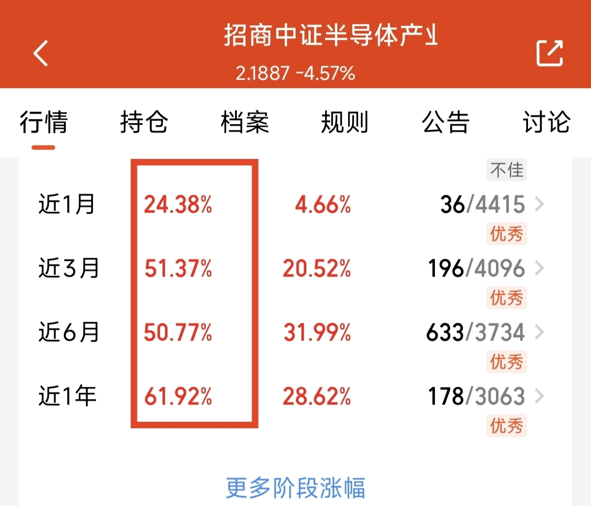 关注到$招商中证半导体产业ETF发起式联接C$ 。这只聚焦半导体的指数基金。精准跟踪中证半导体产业指数,持仓聚焦半导体产业,前十大重仓股包含北方华创、中微公司、海光信息等龙头企业。全面覆盖了半导体上下游产业链。基金跟踪精准度高。近三月涨幅51.37%,同类业绩稳居第一,近一年涨幅达到了61.92%。大幅稳定跑赢同类平均业绩。也是稳稳跑赢了指数的涨幅。长期稳定收益能力强,未来人工智能持续爆发的节奏下,半导体板块的表现值得期待,我坚定看好基金的成长表现。