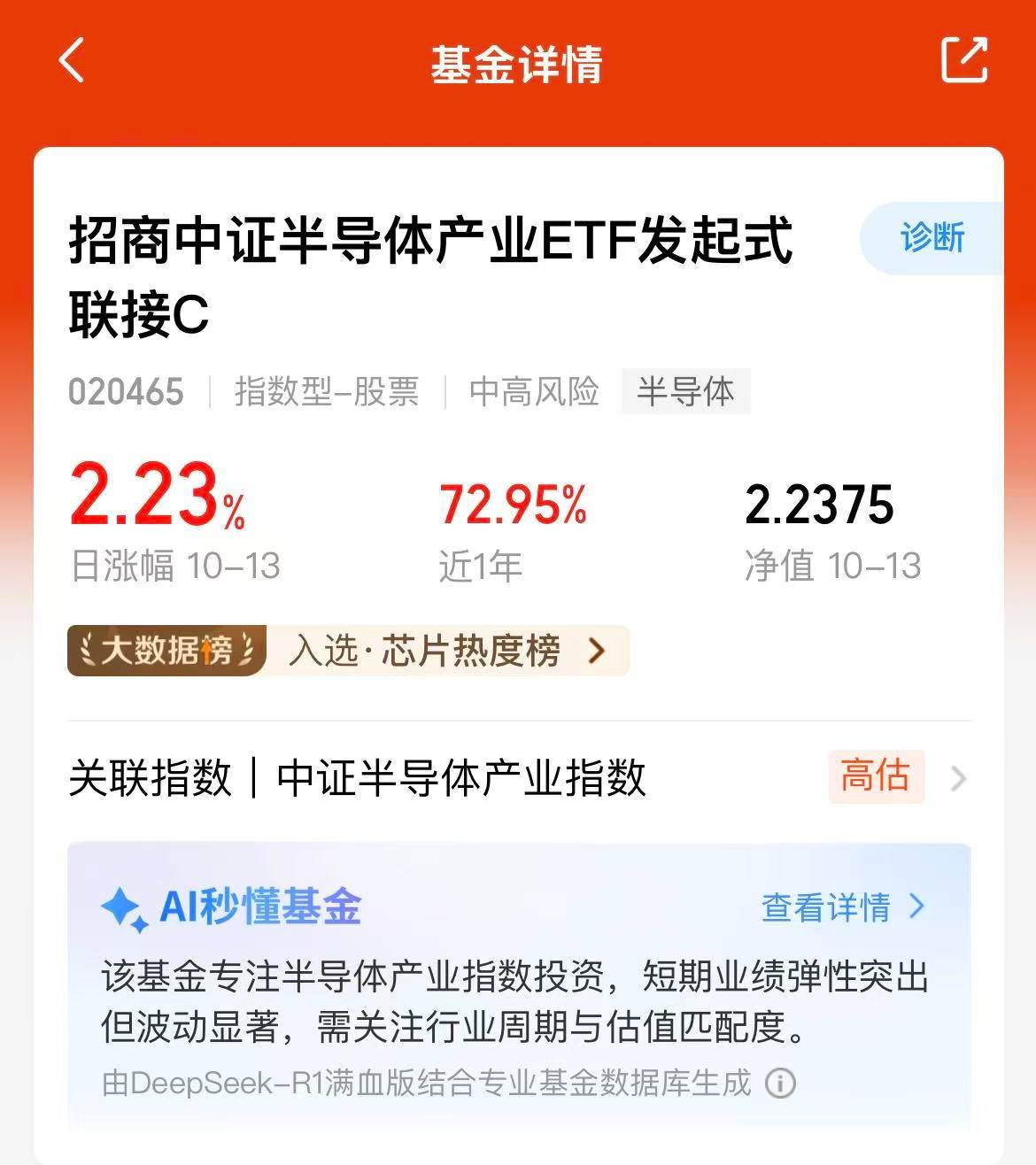 今天大盘高开回落,板块分化,半导体迎来调整,但是产业催化+TMT三季报等利好催化之下,前景还是非常广阔的。$招商中证半导体产业ETF发起式联接C(OTCFUND|020465)$是紧密跟踪中证半导体产业指数的,近三个月涨幅52.62%,业绩优秀,其实行情调整也是不错的机会,科技还是当前的重要主线呢。