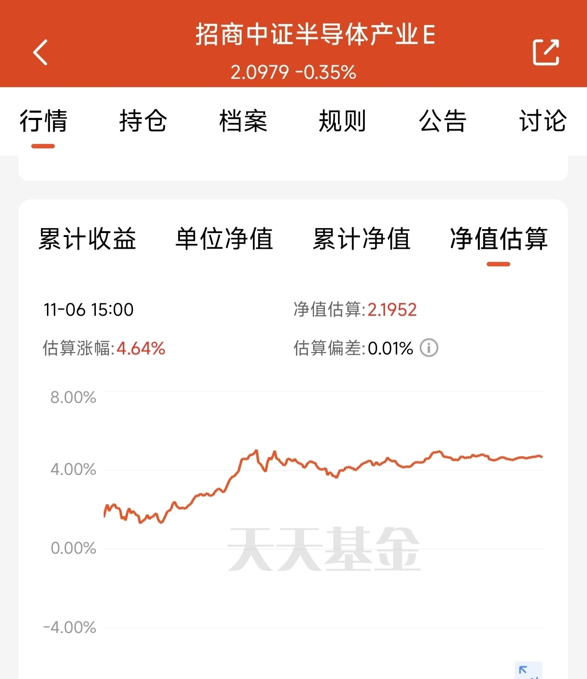 $招商中证半导体产业ETF发起式联接C$ 紧跟中证半导体产业指数。全面覆盖了半导体上下游产业链。无论哪一个环节突破都能够受益。基金紧跟指数的表现一直不错。今天估值上涨了4.74%。长期业绩能力强。同类表现都是做到了优秀。而且遇到波动,稳定性也是比较好的。我坚定看好在未来半导体行情中的成长表现。
