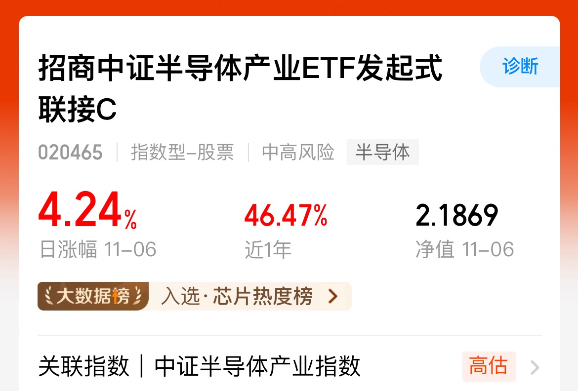 今天市场有点调整,但是我觉得问题不大,毕竟也是上涨了那么多天,偶尔调整一下也属于是良性的回调,调整一下会更健康,半导体今天盘中有点走弱,但是我根本不慌,因为国产持续替代催化的逻辑还是在的打算继续加一笔,我看好的$招商中证半导体产业ETF发起式联接C$ 这只基金不管是长期还是短期拿着都很不错