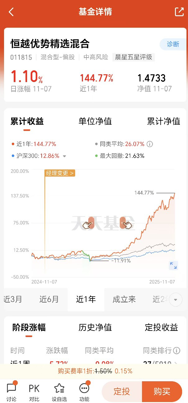 同类第一的黑马基金!恒越优势精选混合近三月 76.68% 大涨,近半年 142.64% 同类第 7。布局储能、存储芯片、固态电池,经理调仓超准,契合科技主线,今日逢低赶紧冲!