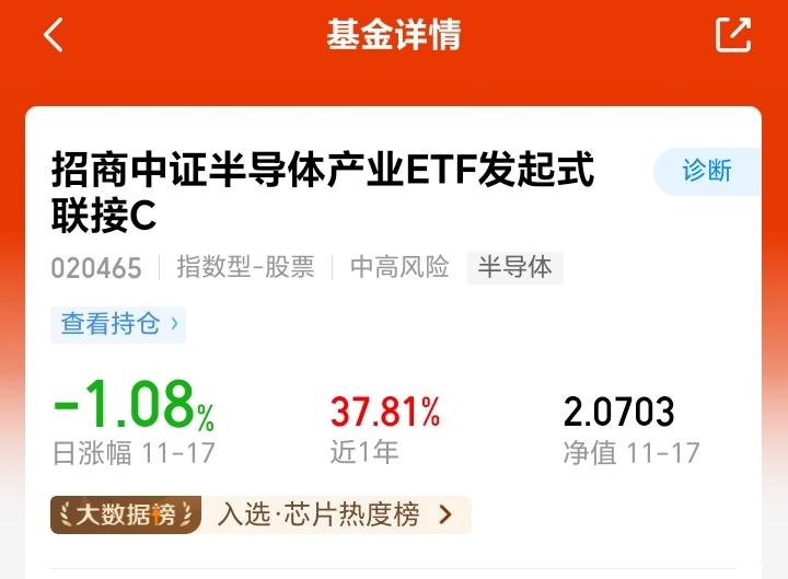 $招商中证半导体产业ETF发起式联接C(OTCFUND|020465)$今日盘中估值涨3.28%,近3月涨29.58%、近6个月涨45.09%,业绩表现不错呢,继续看好接下来的表现。