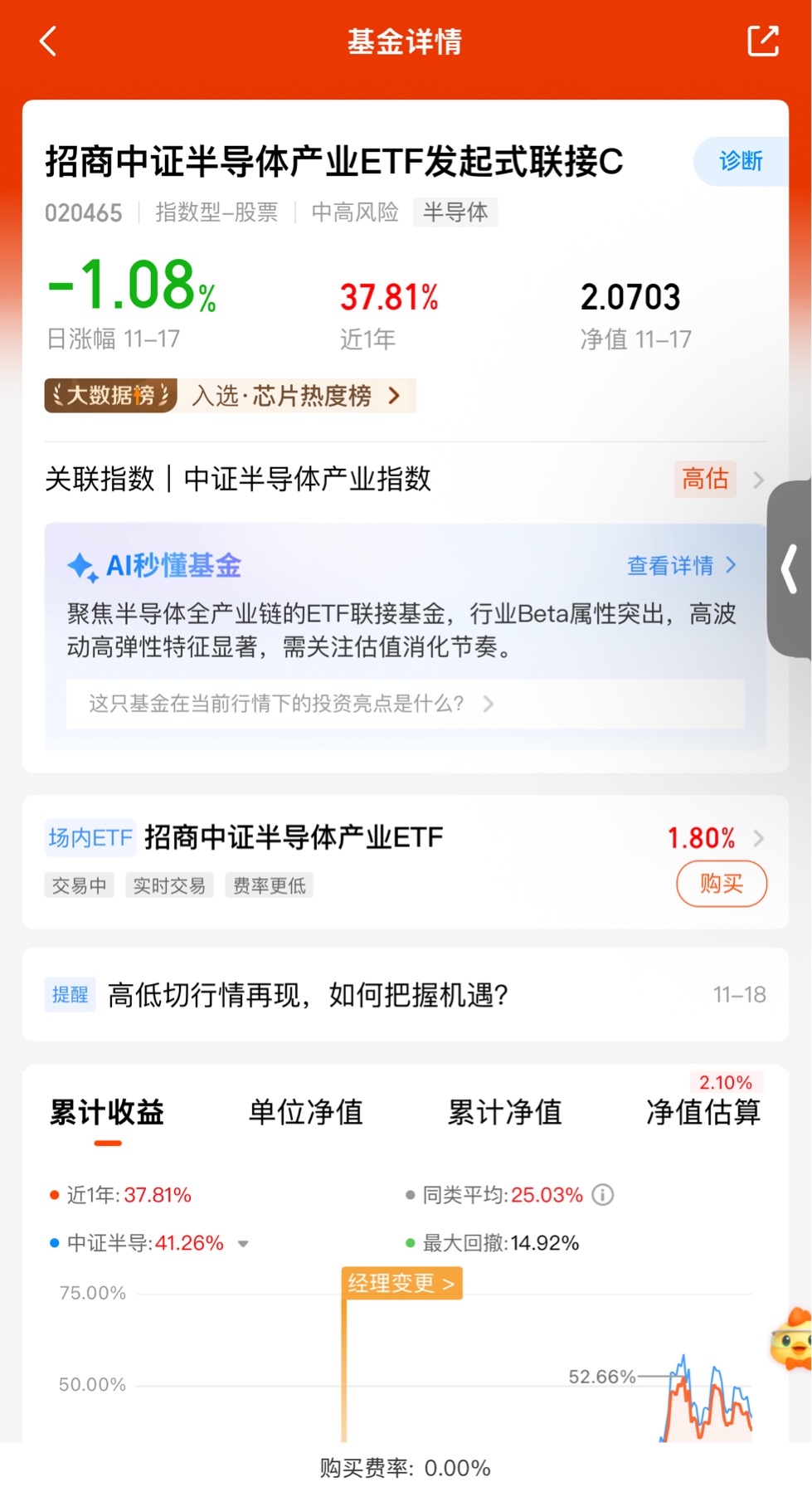 今日半导体板块表现强势,$招商中证半导体产业ETF发起式联接C$ 高开高走,截至午盘大涨近2%,成为市场领涨主力。