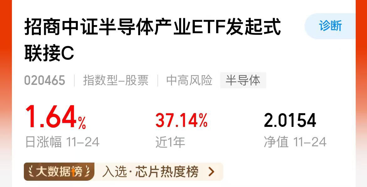 今天半导体行情涨的很不错,行业基本面目前都在好转,今年前三季度半导体企业的收入和利润都比去年有所增长,整个行业似乎进入了一个新的上升周期$招商中证半导体产业ETF发起式联接C$ 这一只基金跟踪中证半导体产业指数,不管是长期还是短期业绩都还很不错,目前盘中估值已经涨超1%,后面的行情值得期待