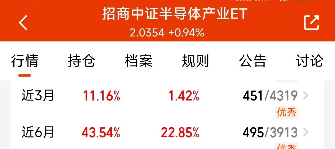 今日 A 股全面反弹,盘面高开高走!摩尔线程已开启申购,半导体国产替代一直在加速,先进逻辑和储能还在扩产,多重利好推着赛道往上走。$招商中证半导体产业ETF发起式联接C(OTCFUND|020465)$盯紧半导体产业链,持仓都是核心标的,近 6 个月涨了 43%,远超同类平均。现在行业景气度在线,资金也在关注.