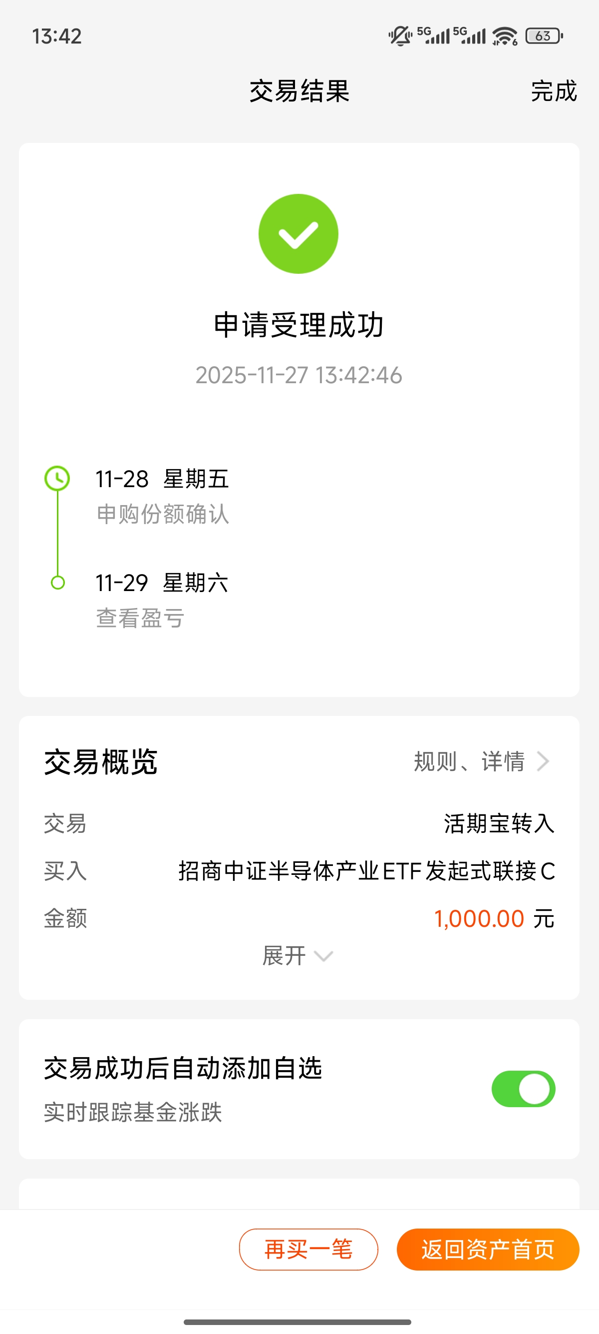 对投资者来说,可以通过招商中证半导体产业ETF发起式链接C(020465)来把握投资机会,继续买入1000元。