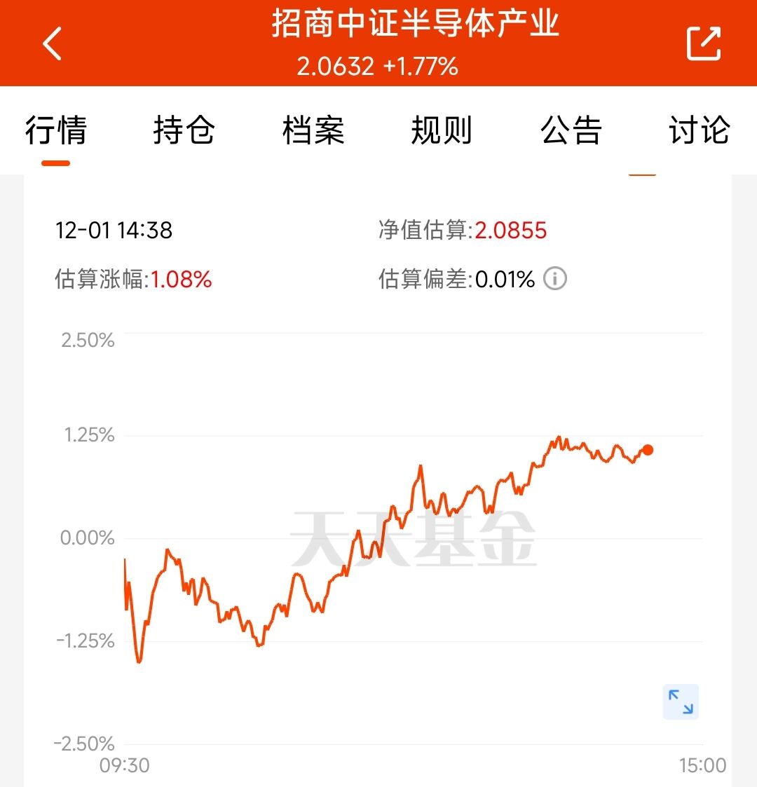 开门红,今天 A 股接着反弹,三大指数高开高走,走势挺给力。午后科技方向彻底发力,涨幅特别优秀,半导体板块更是延续吃肉行情!$招商中证半导体产业ETF发起式联接C(OTCFUND|020465)$业绩一直很亮眼,盈利能力也不错,近六个月更是涨了48%,成长逻辑在线,未来可期。我继续看好这个赛道,打算保持持仓,跟着板块节奏走.