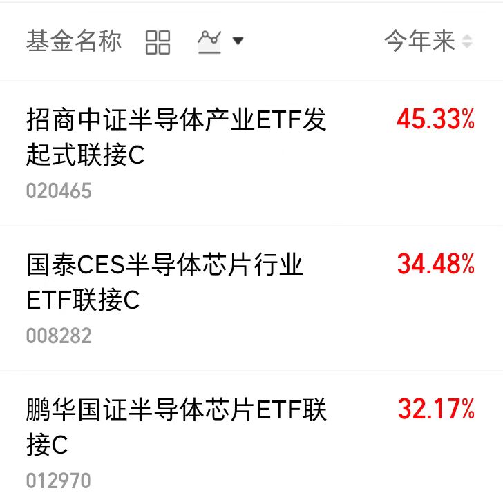 $招商中证半导体产业ETF发起式联接C(OTCFUND|020465)$今年来上涨45.33%$国泰CES半导体芯片行业ETF联接C(OTCFUND|008282)$今年来上涨34.48%
