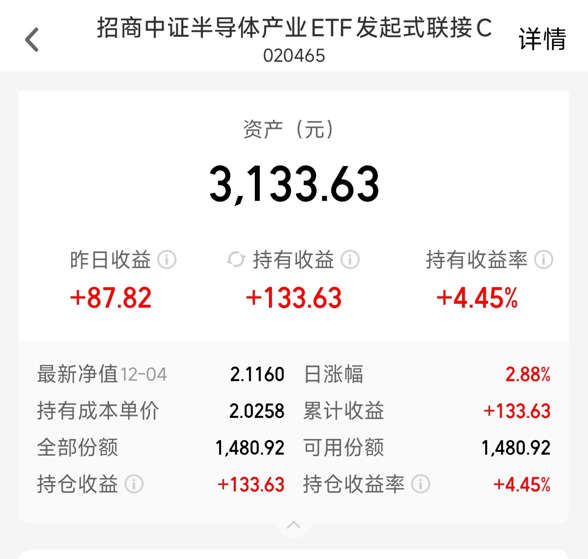 通过摩尔线程的热度,可以看到,投资者对国产半导体的追捧,后市半导体依然看好,目前持有的招商中证半导体产业ETF发起式联接C收益4.45%,看好的理由主要有三个: