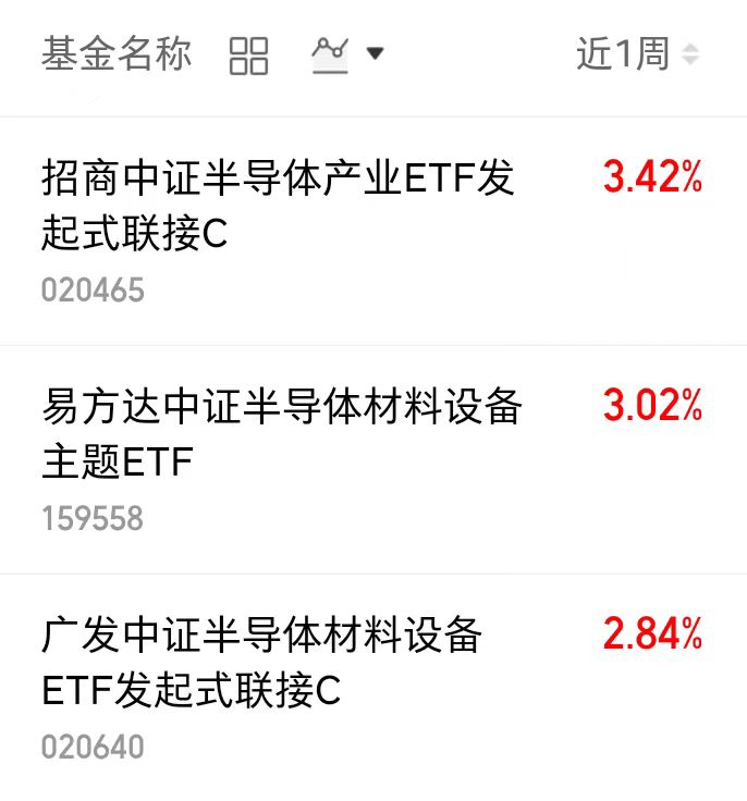 $招商中证半导体产业ETF发起式联接C(OTCFUND|020465)$近一周上涨3.42%$广发中证半导体材料设备ETF发起式联接C(OTCFUND|020640)$近一周上涨2.84%