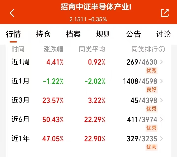 今天市场低开低走,大科技板块集体回调,半导体赛道早盘冲高后快速回落,盘中波动加剧。芯片产业链中上游的设备、材料与集成电路设计,不仅价值量突出,更有国家大基金三期重点加持,国产替代进程正加速推进。我关注的$招商中证半导体产业ETF发起式联接C(OTCFUND|020465)$聚焦半导体产业链,今日小幅回调;近3月涨 23.57%、近6月上涨50.43%,表现亮眼。我依旧坚定看好国产替代主线,逢低补仓看好后市再度反弹啦!