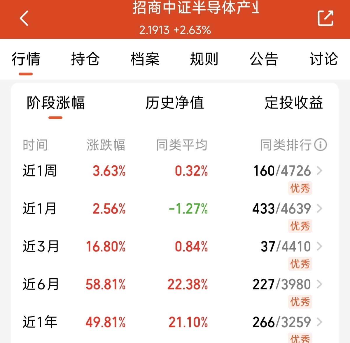 今天我开始布局关注已久的$招商中证半导体产业ETF发起式联接C$ 是聚焦半导体产业的指数基金。紧密跟踪中证半导体产业指数。全面覆盖了半导体的上下游产业链。所以说无论哪一个环节上涨都是能够收益。在本轮中的表现一直不错。周五上涨了2.63%。同类业绩再度做到了领先。近半年上涨了58.81%。是同类平均业绩的三倍还多。我看好未来在半导体行情中的成长表现。今天也开始布局了。