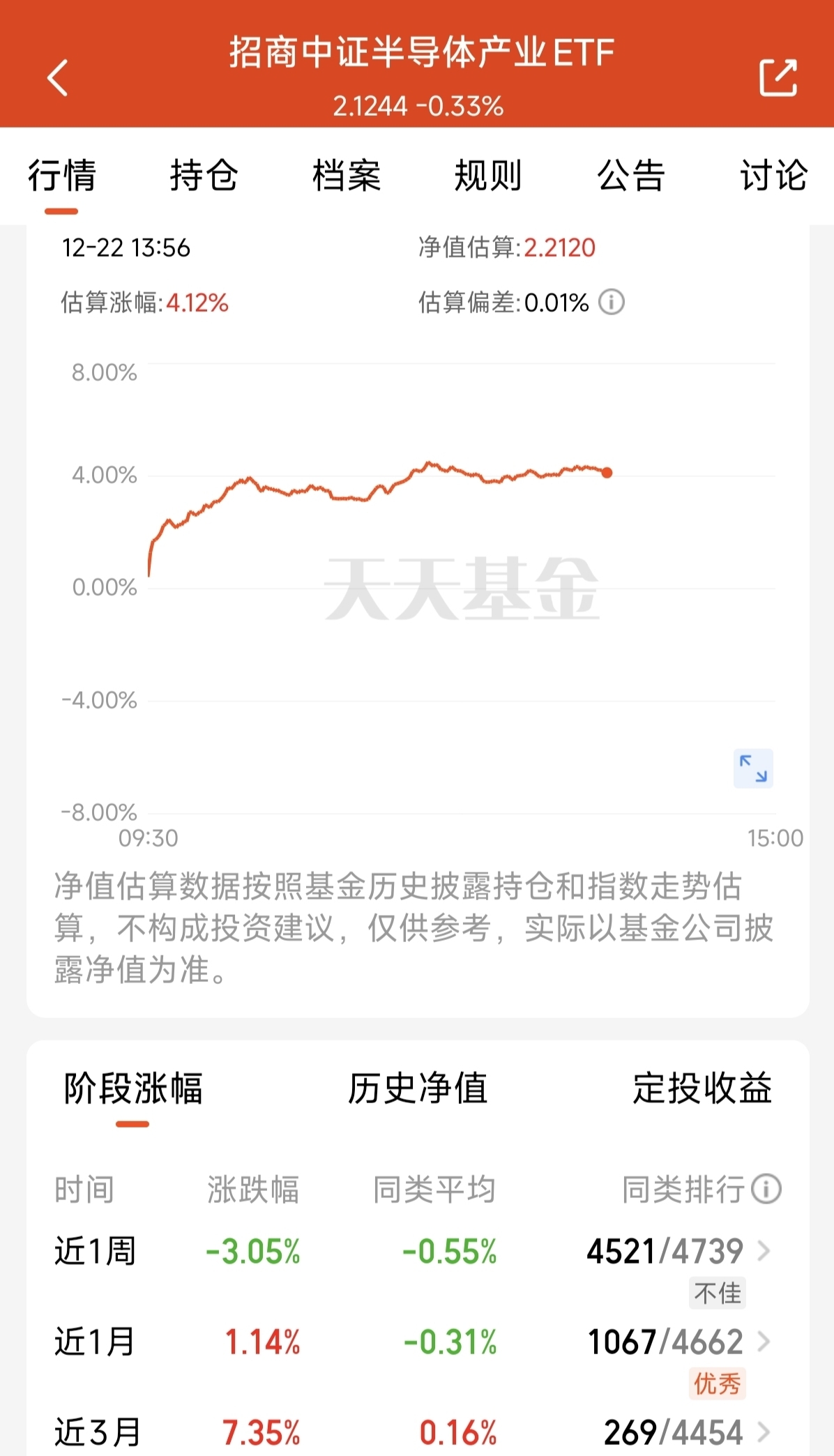 $招商中证半导体产业ETF发起式联接C$ 这是聚焦半导体产业的指数基金。紧密跟踪中证半导体产业指数。无论中间哪一个环节上涨都能够受益。今天的估值涨超了四个点。爆发力的表现强。近1月半导体芯片持续回调。基金还逆势上涨了1.13%。长期业绩做的也是比较稳定。我看好基金在未来半导体产业中的成长表现。