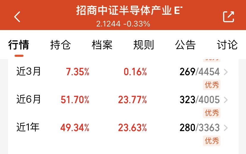 半导体板块今天强势上涨,中证半导体指数预估涨幅 4.34%。国产半导体产业链国产替代进程持续加速,长期发展前景向好。招商中证半导体产业 C 近6个月涨幅达 51%,业绩亮眼。目前板块调整基本到位,我看好后续行情,准备分批加仓布局!