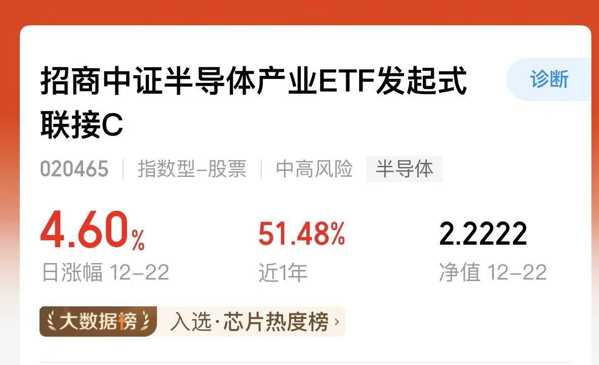 今天市场继续上涨,延续了昨天上涨的走势,随着指数的高开高走,科技板块表现比较活跃,其中半导体板块涨了不少。$招商中证半导体产业ETF发起式联接C$ 这只基金近期业绩还是不错的,昨天单日上涨竟然达到4.60%,近一年的涨幅也达到51.48%。