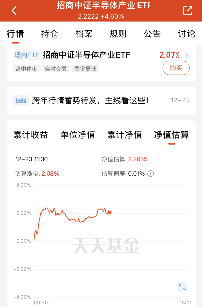 早盘三大指数向上,科技板块继续走强,半导体芯片更是领涨全场。$招商中证半导体产业ETF发起式联接C(OTCFUND|020465)$估值上涨超 2%,表现超给力。半导体设备自主可控是确定性强、弹性足的主线,AI 需求带动产能扩张,市场空间持续增长,半导体行情值得继续看好。