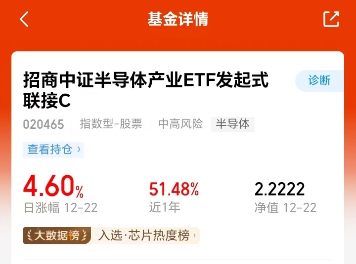 $招商中证半导体产业ETF发起式联接C(OTCFUND|020465)$全面覆盖产业链龙头,重仓集中度高,昨天上涨4.6%,,今日盘中上涨2.06%,近六月大涨 51.484%,我看好后续表现啦。