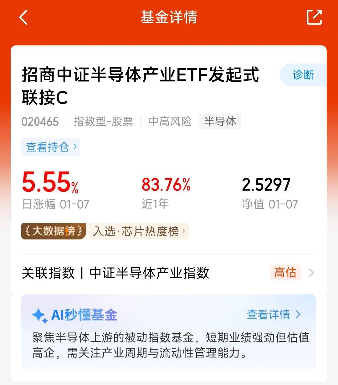 半导体板块今天继续走高,招商中证半导体产业联接 C 昨日涨幅达 5.55%。指数慢牛的基调大概率不会改变,当下投资核心应该放在赛道选择上,看好半导体产品应用企业与产业链的协同发展前景。这只基金近一周上涨 13.42%,业绩表现十分亮眼。我继续持有这只基金,长期看好它的发展潜力。