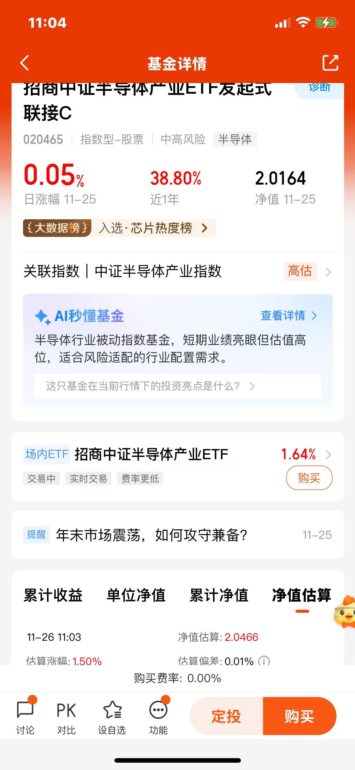 $招商中证半导体产业ETF发起式联接C(OTCFUND|020465)$当前估值涨超1.5%,还在继续向上冲