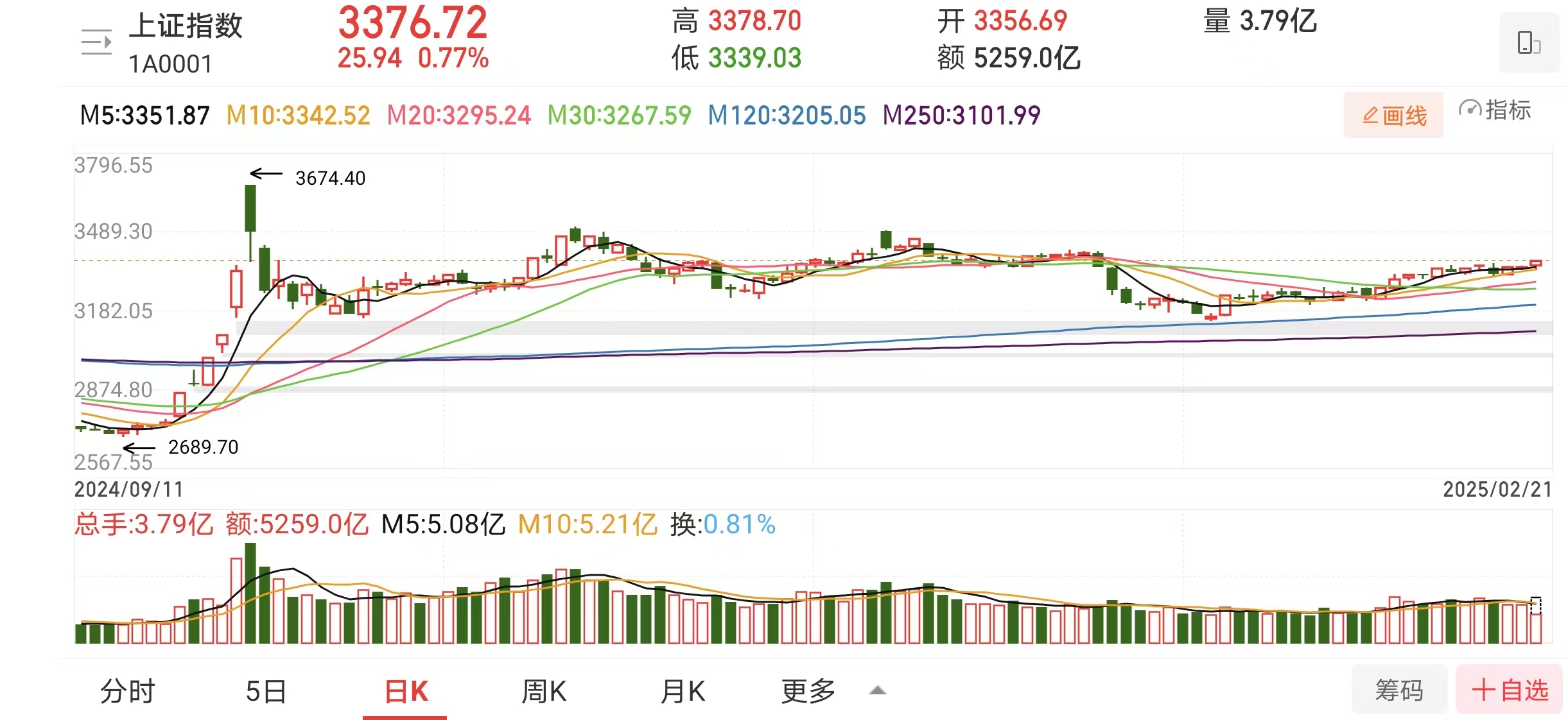 2月21日A股三大指数集体强势上涨,截止上午休市时,上证指数涨0.77%,深证成指涨1.62%,创业板指涨2.23%,成交量13732亿,相比上一个交易日同期放量2239亿,估计全天量能2.1万亿左右。两市有2720只个股上涨,有2492家下跌,涨跌参半,但科技整体强势反弹,赚钱效应不错。上证指数小幅下探至水下后逐渐转强,目前已经稳稳站上5天10天均线,K线重心继续上移,即将收复去年12月31日的阴线。我认为大盘走势稳健,下周依然是震荡上行为主,我今天加仓半导体芯片、港股通互联网和一支债基。