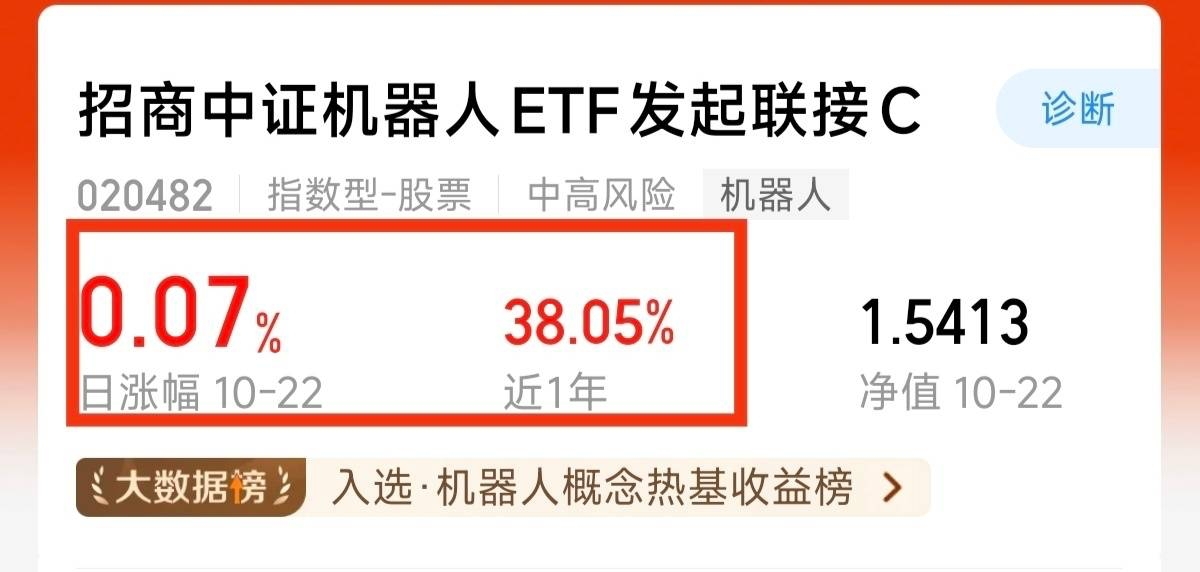 今天又关注到$招商中证机器人ETF发起联接C$ 这只聚焦机器人的指数基金。 紧密跟踪中证机器人指数。全面覆盖了机器人产业链的上下游,昨天市场回调,还做到了逆势上涨0.07%。近一年涨幅38.05%。都是由于其他同类机器人指数基金,长期表现做到了涨多跌少。而且采用指数化的投资。不用担心主动调仓带来的波动风险。我看好在未来机器人板块上涨中的收益表现!#高盛看多A股:慢牛正形成 还有约30%上涨空间# $易方达机器人ETF联接C$