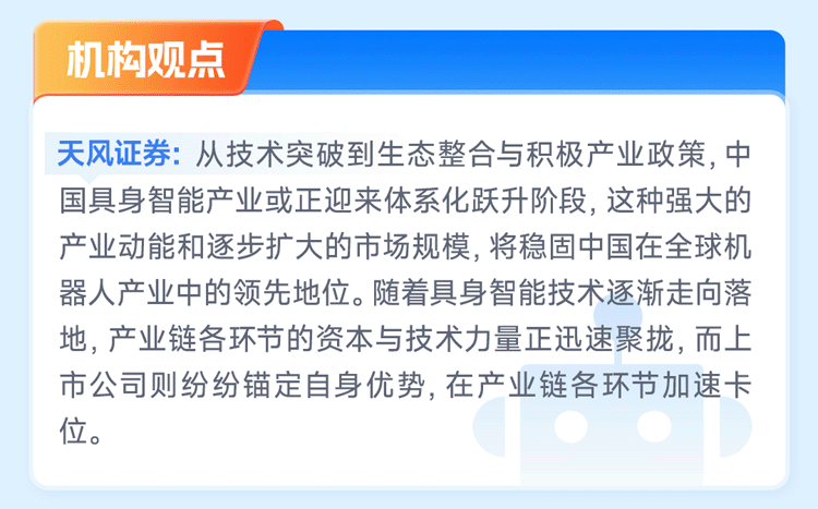 从技术突破到生态整合与积极产业政策,中国具身智能产业或正迎来体系化跃升阶段,这种强大的产业动能和逐步扩大的市场规模,将稳固中国在全球机器人产业中的领先地位。随着具身智能技术逐渐走向落地,产业链各环节的资本与技术力量正迅速聚拢,而上市公司则纷纷锚定自身优势,在产业链各环节加速卡位。