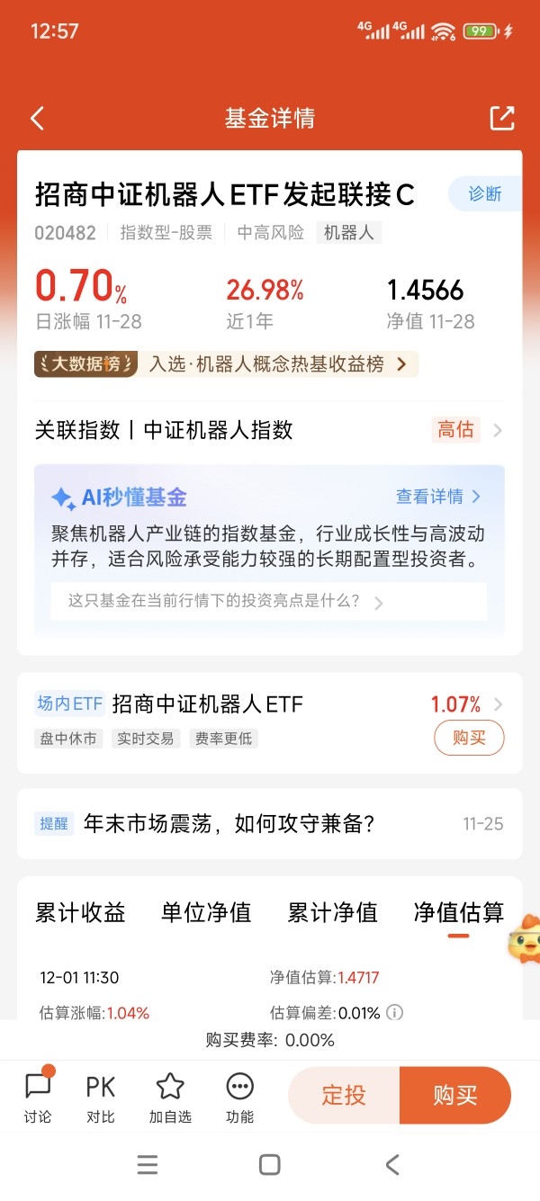 $招商中证机器人ETF发起联接C$ 这是聚焦机器人的指数基金。紧密跟踪中证机器人指数。对比市面上多数的机器人指数来看,中证机器人指数,人形机器人的含比更高。所以说来一直表现的也是比较强,因为今年的风口主要在人形机器人。从业绩表现来看,周五上涨了0.7%。今天的估值上涨了1.2%。同类基金再次做到了领先。我看好长期的收益表现。准备开始布局了。