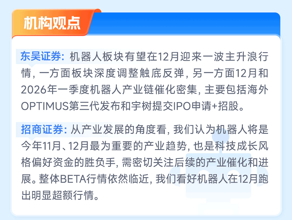 东吴证券:机器人板块有望在12月迎来一波主升浪行情,一方面板块深度调整触底反弹,另一方面12月和2026年一季度机器人产业链催化密集,主要包括海外OPTIMUS第三代发布和宇树提交IPO申请+招股。