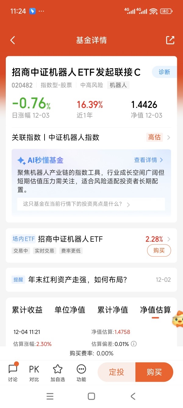 $招商中证机器人ETF发起联接C$ 这次聚焦机器人产业的指数基金。紧密跟踪中证机器人指数。指数中人形机器人的含比更高。所以说在本轮行情中的表现也是更好。今天的估值涨幅2.3%。同类表现再次做到了领先,而且在前期机器人调整的阶段,稳定性的表现也是不错,我看好长期的收益表现。#12月基金投资策略#