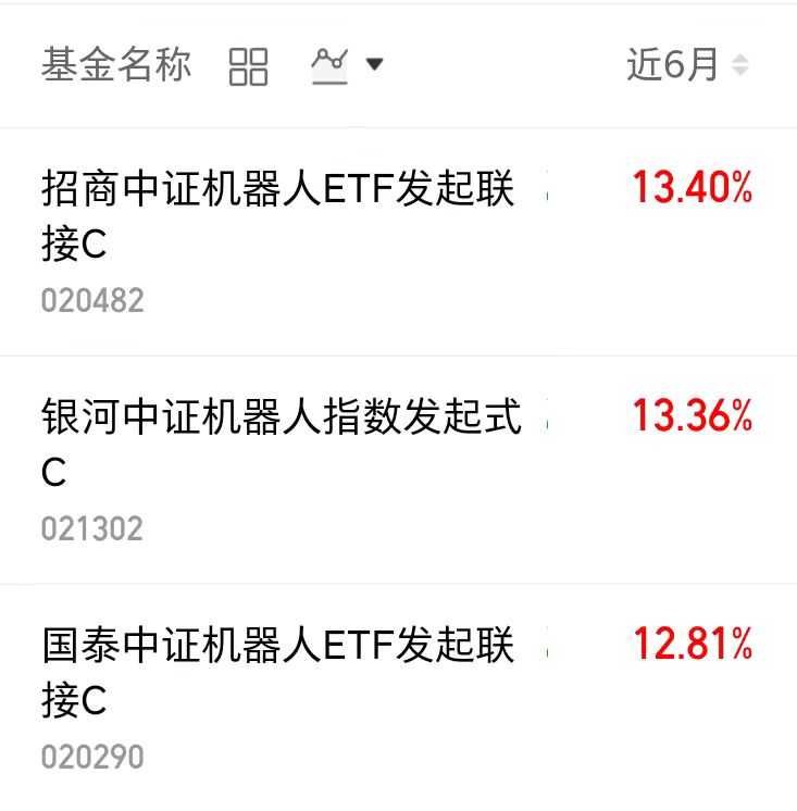$银河中证机器人指数发起式C(OTCFUND|021302)$近半年上涨13.36%$国泰中证机器人ETF发起联接C(OTCFUND|020290)$近半年上涨12.81%