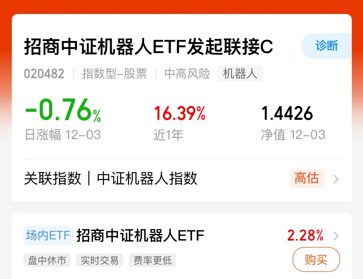 这段时间市场一直在反复的来回跳,反复波动下,一直没有涨回来的板块机器人算是回调比较大的,但是昨天夜里美股机器人方向大涨,今天机器人在市场又是涨的,看来反弹的行情已经来到了$招商中证机器人ETF发起联接C$ 业绩做得比较稳定,今年以来已经涨了20.96%了