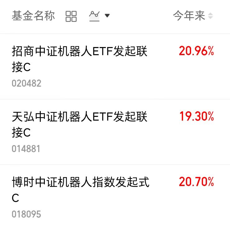 $招商中证机器人ETF发起联接C(OTCFUND|020482)$今年来上涨20.96%$天弘中证机器人ETF发起联接C(OTCFUND|014881)$今年来上涨19.3%