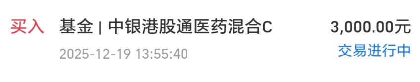 今天我买入$中银港股通医药混合发起C(OTCFUND|020398)$3000块钱。