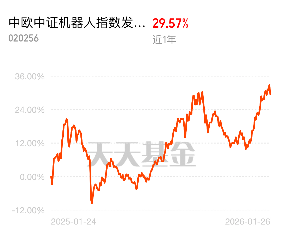 人形机器人赛道好消息扎堆来,1 月 26 日晚宇树科技官宣 2026 春晚合作,魔法原子和银河通用早早就敲定了春晚席位,赛道景气度拉满,$中欧中证机器人指数发起C$ 近 1 年涨 29.57%,现在入场太合适