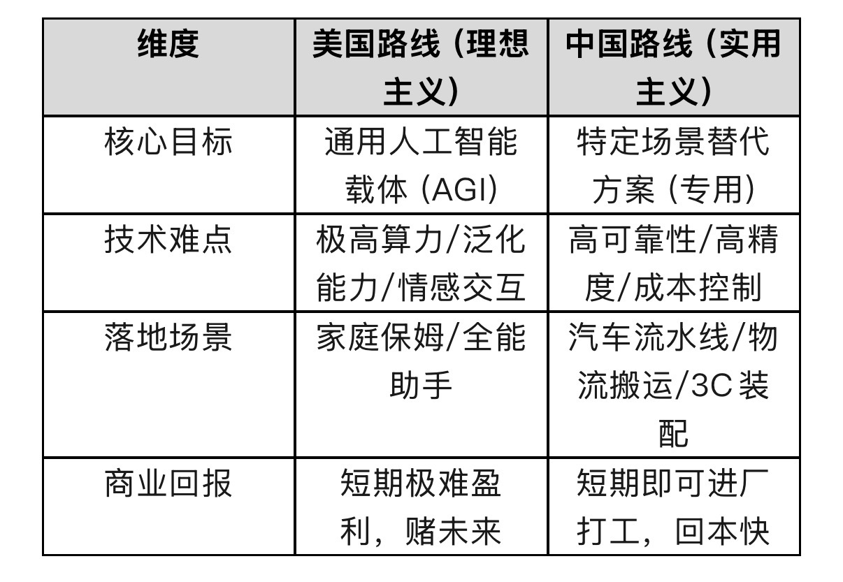 这引出了一个更深层的路线之争:在这场竞赛中,中国和美国谁的方向更对?大摩的报告观察到一个关键差异:中国集成商采取了更“务实”的策略。以特斯拉为代表的美国路线,梦想打造一个“通才”——能像人一样思考、应对各种场景的通用机器人。而中国的路径,更像是打造“专才”:一个能立刻进工厂,精准完成搬运、打磨、装配等特定任务的“熟练工”。这两种愿景没有绝对高下,却深刻反映了两国产业土壤的差异。