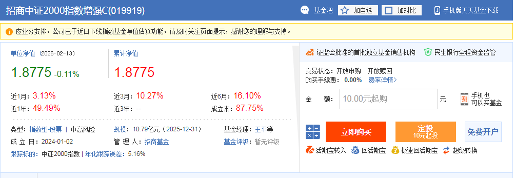 $招商中证2000指数增强C(OTCFUND|019919)$